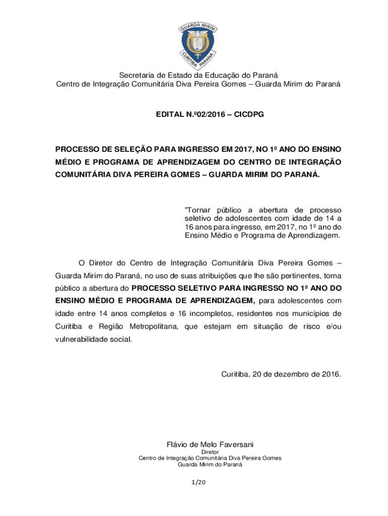Secretariat de Estado the Educator do Pagan CENTR de Integrao Communitarian Diva Pereira Gomes Guard Miriam do Paramedical N.02/2016 CICDPGPROCESSO DE SEL EO PARA INGRESS OEM 2017, NO 1 ANO DO ENSI
