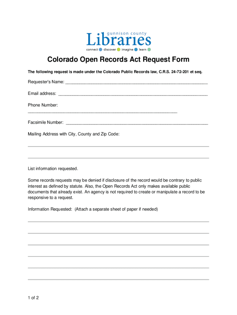 Colorado Open Records Act Request Form The following request is made under the Colorado Public Records law, C.R.S. 2472201 et seq. Requester\'s Name: ___ Email address: ___ Phone Number: ___ Facsimile