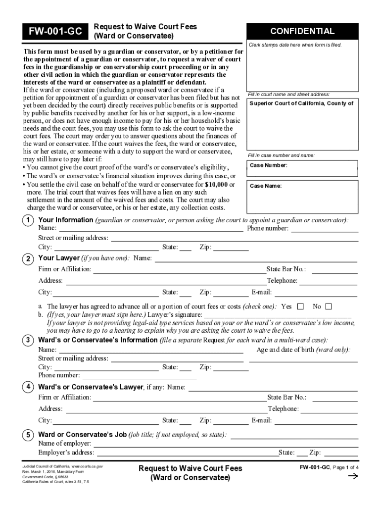 FW001GCRequest to Waive Court Fees (Ward or Conservative)CONFIDENTIAL Clerk stamps date here when form is filed. This form must be used by a guardian or conservator, or by a petitioner for the appointment