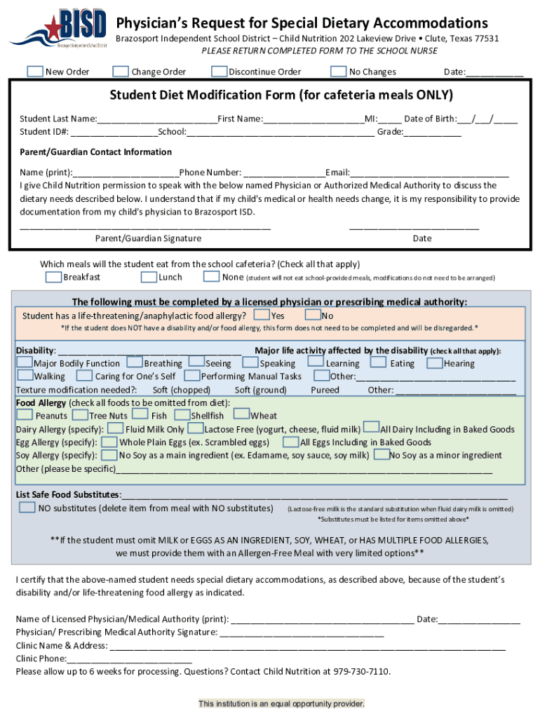 Physicians Request for Special Dietary AccommodationsBrazosport Independent School District Child Nutrition 202 Lake view Drive Flute, Texas 77531