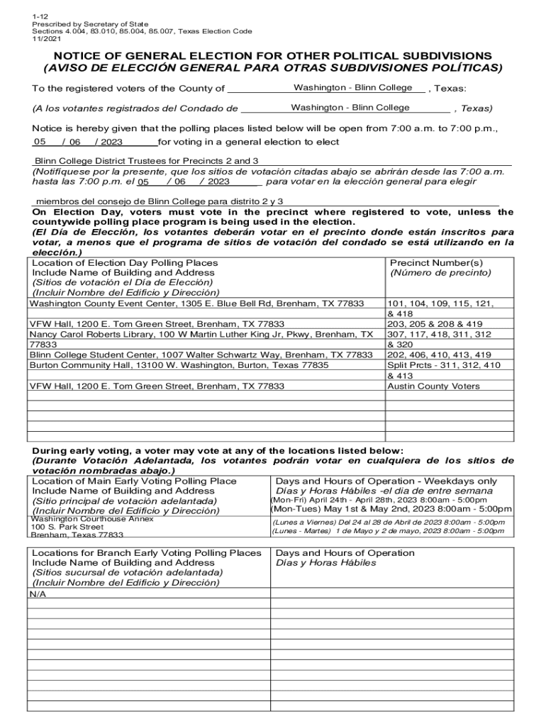 112 Prescribed by Secretary of State Sections 4.004, 83.010, 85.004, 85.007, Texas Election Code 11/2021NOTICE OF GENERAL ELECTION FOR OTHER POLITICAL SUBDIVISIONS (AVIS ODE ELECTION GENERAL PARA
