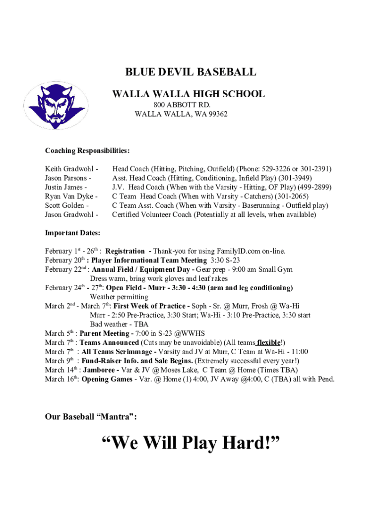 BLUE DEVIL BASEBALL WALL HIGH SCHOOL 800 ABBOTT RD. WALL, WA 99362Coaching Responsibilities: Keith Gradual Jason Parsons Justin James Ryan Van Dyke Scott Golden Jason Gradual Head Coach (Hitting,