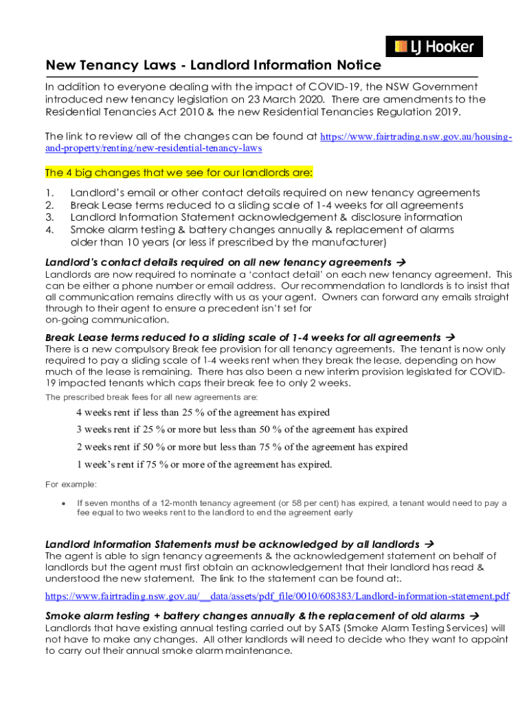 New Tenancy Laws Landlord Information Notice In addition to everyone dealing with the impact of COVID-19, the NSW Government introduced new tenancy legislation on 23 March 2020. There are amendments