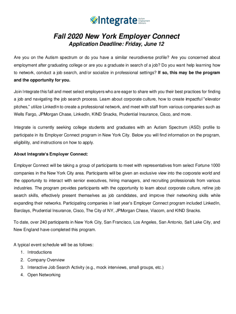 Fall 2020 New York Employer Connect Application Deadline: Friday, June 12 Are you on the Autism spectrum or do you have a similar neurodiverse profile? Are you concerned about employment after graduating