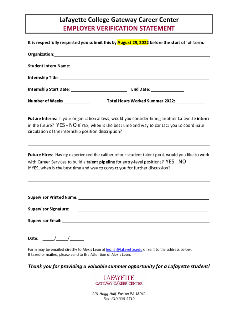 Lafayette College Gateway Career Center EMPLOYER VERIFICATION STATEMENT It is respectfully requested you submit this by August 29, 2022, before the start of fall term. Organization:___ Student Intern
