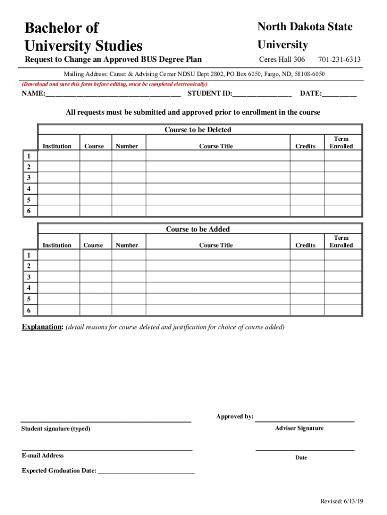 Bachelor of University Studies North Dakota State University Ceres Hall 306Request to Change an Approved BUS Degree Plan7012316313Mailing Address: Career & Advising Center DSU Dept 2802, PO Box 6050,