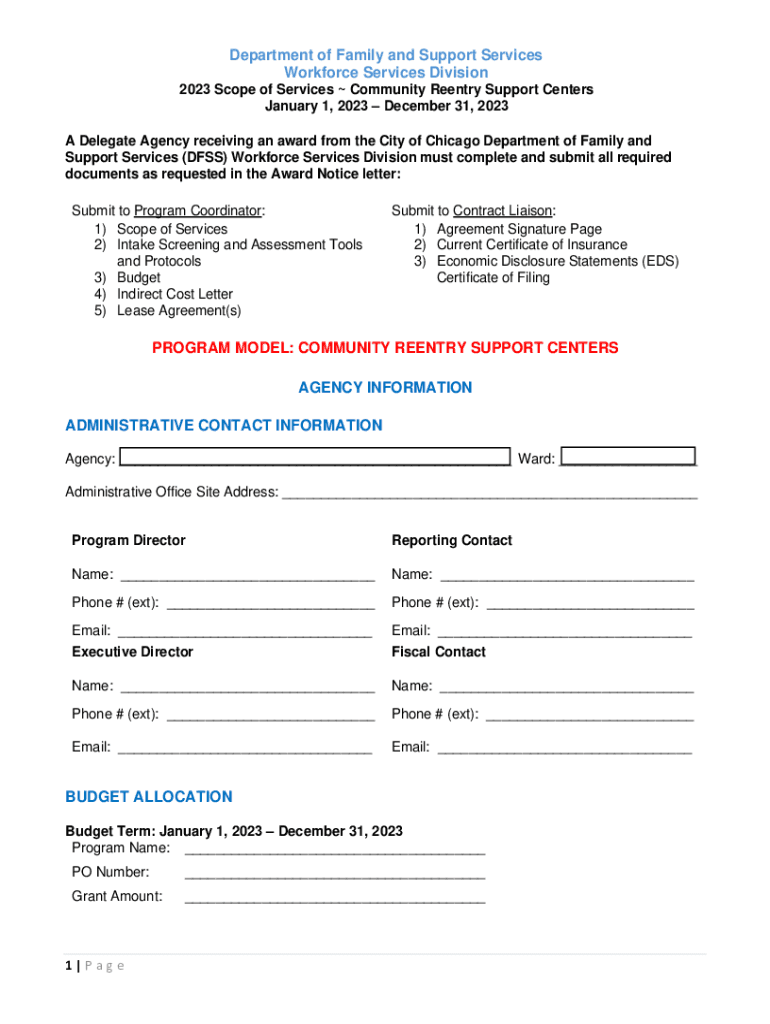 Department of Family and Support Services Workforce Services Division 2023 Scope of Services Community Reentry Support Centers January 1, 2023, December 31, 2023 A Delegate Agency receiving an award