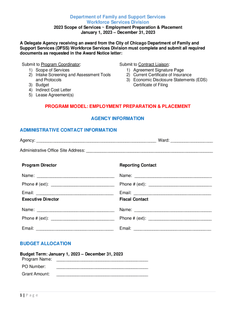 Department of Family and Support Services Workforce Services Division 2023 Scope of Services Employment Preparation & Placement January 1, 2023, December 31, 2023 A Delegate Agency receiving an award