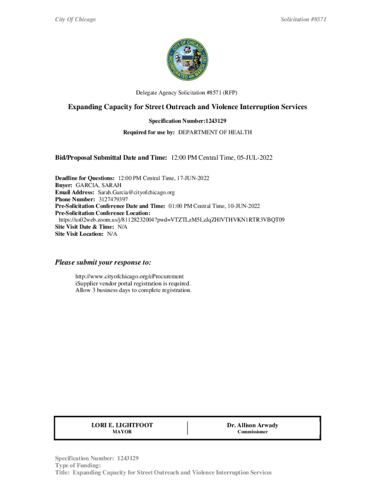 City Of ChicagoSolicitation #8571Delegate Agency Solicitation #8571 (RFP)Expanding Capacity for Street Outreach and Violence Interruption Services Specification Number:1243129 Required for use by: