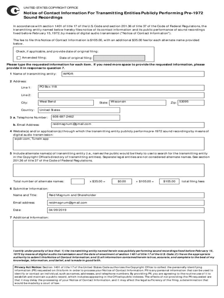 UNITED STATES COPYRIGHT OFFICENotice of Contact Information For Transmitting Entities Publicly Performing Pre1972 Sound Recordings In accordance with section 1401 of title 17 of the U.S. Code and