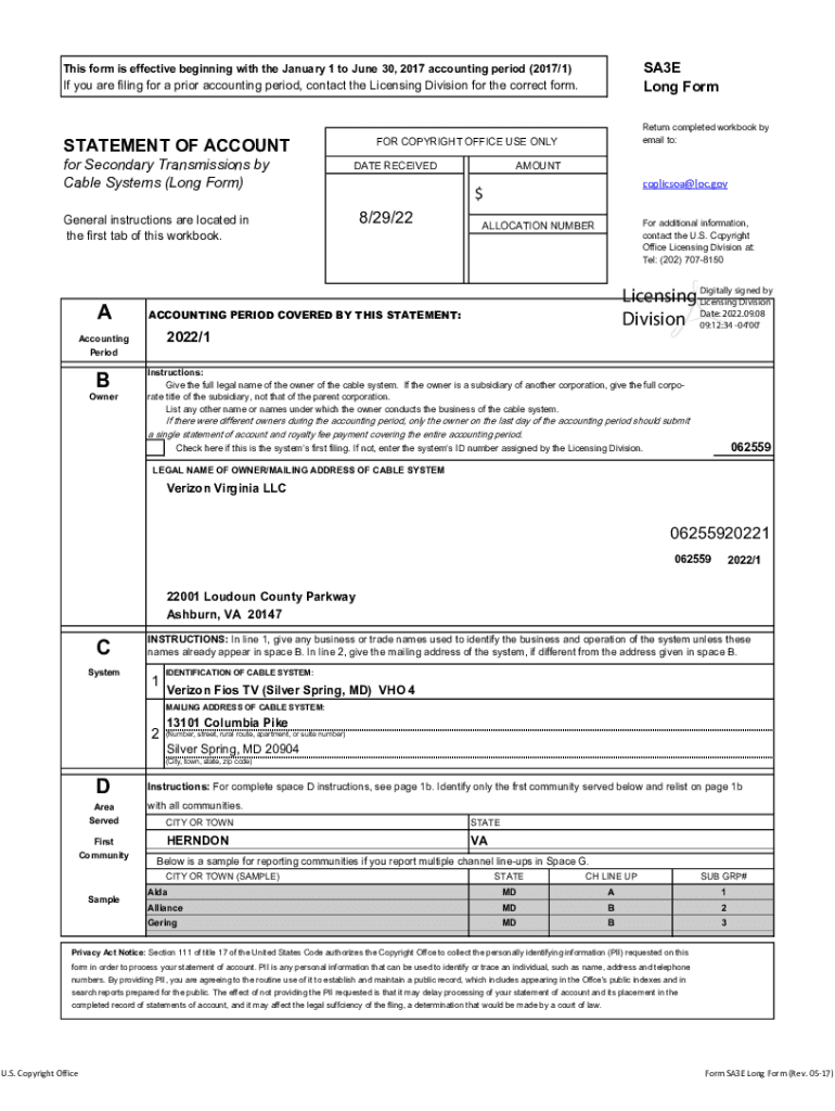 SA3E Long Forms form is effective beginning with the January 1 to June 30, 2017, accounting period (2017/1)If you are filing for a prior accounting period, contact the Licensing Division for the correct