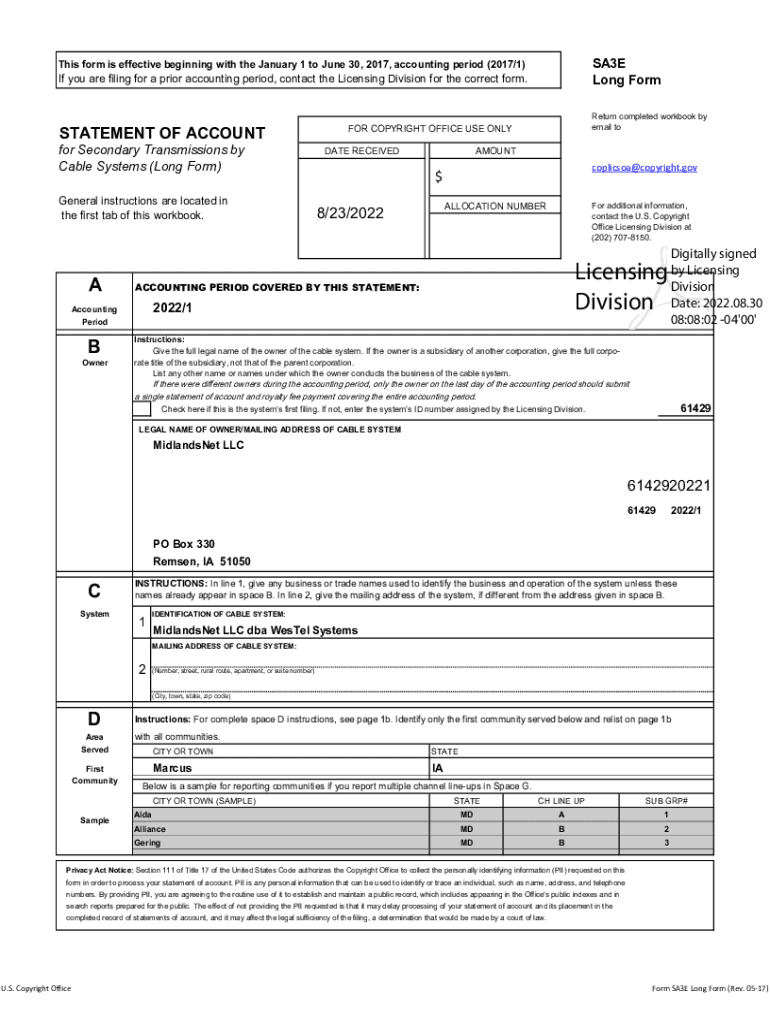 SA3E Long Forms form is effective beginning with the January 1 to June 30, 2017, accounting period (2017/1)If you are filing for a prior accounting period, contact the Licensing Division for the correct