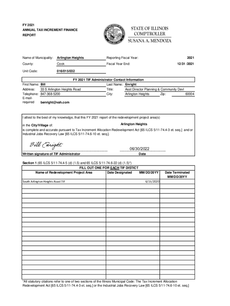 FY 2021 ANNUAL TAX INCREMENT FINANCE Reportage of Municipality:Arlington HeightsReporting Fiscal Year:County:CookFiscal Year End:Unit Code:016/015/032First Name: Address: Telephone: Emailrequired2021