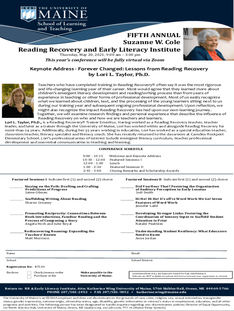 FIFTH ANNUAL Suzanne W. Cole Reading Recovery and Early Literacy Institute Thursday, May 20, 2021, 9:00 am 3:00 this year's conference will be fully virtual via Zoom Keynote Address Forever Changed:
