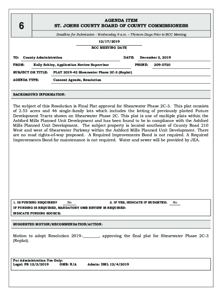AGENDA ITEM ST. JOHNS COUNTY BOARD OF COUNTY COMMISSIONERS6Deadline for Submission Wednesday 9 a.m. Thirteen Days Prior to BCC Meeting 12/17/2019 BCC MEETING DATE TO:County AdministrationFROM:DATE:Kelly
