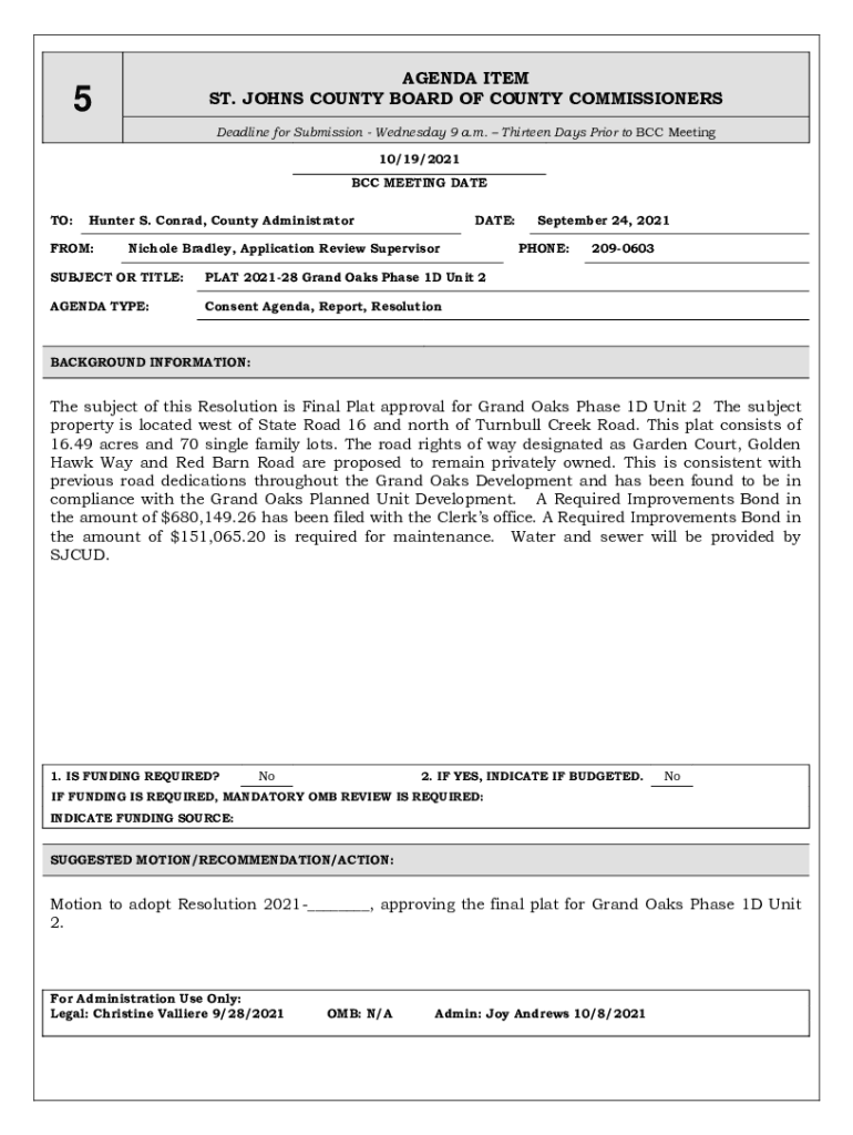 AGENDA ITEM ST. JOHNS COUNTY BOARD OF COUNTY COMMISSIONERS5Deadline for Submission Wednesday 9 a.m. Thirteen Days Prior to BCC Meeting 10/19/2021 BCC MEETING DATE TO:Hunter S. Conrad, County AdministratorFROM:DATE:Nichole