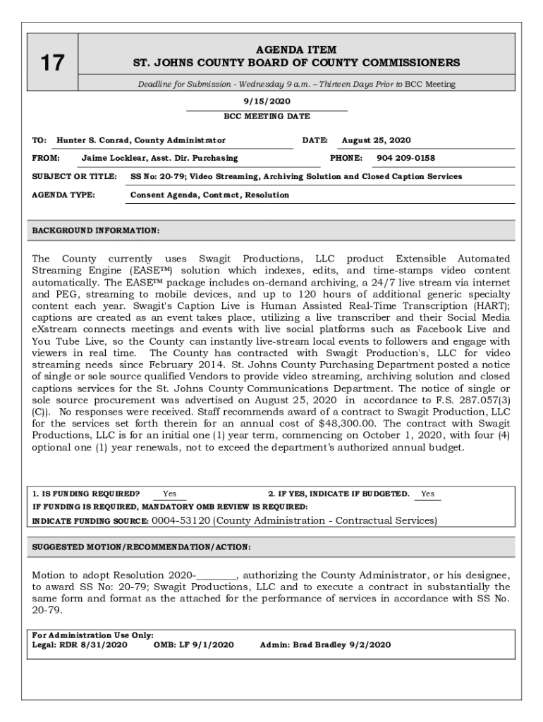 AGENDA ITEM ST. JOHNS COUNTY BOARD OF COUNTY COMMISSIONERS17Deadline for Submission Wednesday 9 a.m. Thirteen Days Prior to BCC Meeting 9/15/2020 BCC MEETING DATE TO:Hunter S. Conrad, County AdministratorFROM:DATE:Jaime