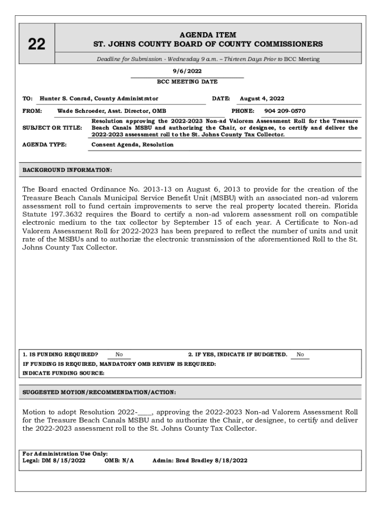 AGENDA ITEM ST. JOHNS COUNTY BOARD OF COUNTY COMMISSIONERS22Deadline for Submission Wednesday 9 a.m. Thirteen Days Prior to BCC Meeting 9/6/2022 BCC MEETING DATE TO:Hunter S. Conrad, County AdministratorFROM:DATE:Wade