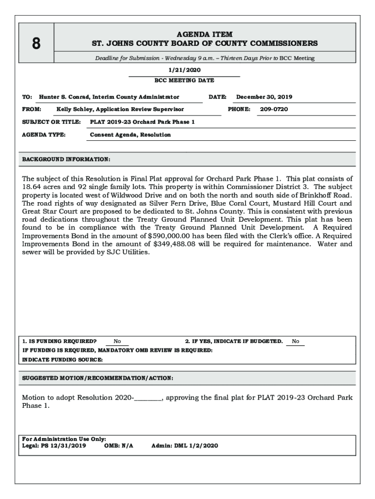 AGENDA ITEM ST. JOHNS COUNTY BOARD OF COUNTY COMMISSIONERS8Deadline for Submission Wednesday 9 a.m. Thirteen Days Prior to BCC Meeting 1/21/2020 BCC MEETING DATE TO:Hunter S. Conrad, Interim County