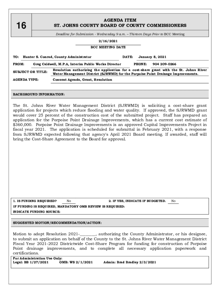 AGENDA ITEM ST. JOHNS COUNTY BOARD OF COUNTY COMMISSIONERS16Deadline for Submission Wednesday 9 a.m. Thirteen Days Prior to BCC Meeting 2/16/2021 BCC MEETING DATE TO:Hunter S. Conrad, County AdministratorFROM:DATE:Greg