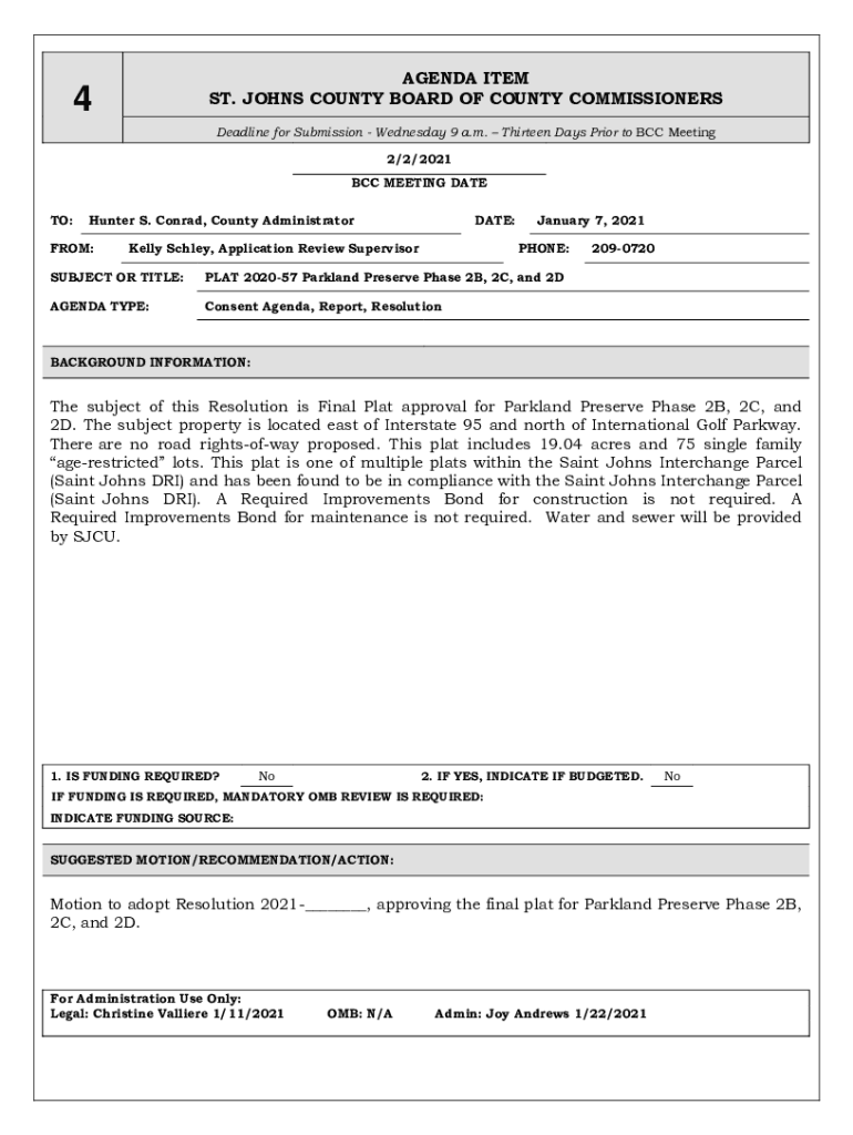 AGENDA ITEM ST. JOHNS COUNTY BOARD OF COUNTY COMMISSIONERS4Deadline for Submission Wednesday 9 a.m. Thirteen Days Prior to BCC Meeting 2/2/2021 BCC MEETING DATE TO:Hunter S. Conrad, County AdministratorFROM:DATE:Kelly