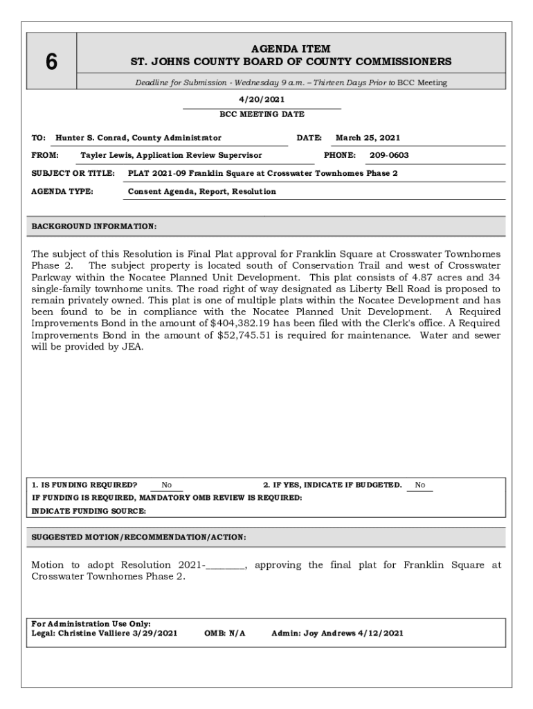 AGENDA ITEM ST. JOHNS COUNTY BOARD OF COUNTY COMMISSIONERS6Deadline for Submission Wednesday 9 a.m. Thirteen Days Prior to BCC Meeting 4/20/2021 BCC MEETING DATE TO:Hunter S. Conrad, County AdministratorFROM:DATE:Taylor