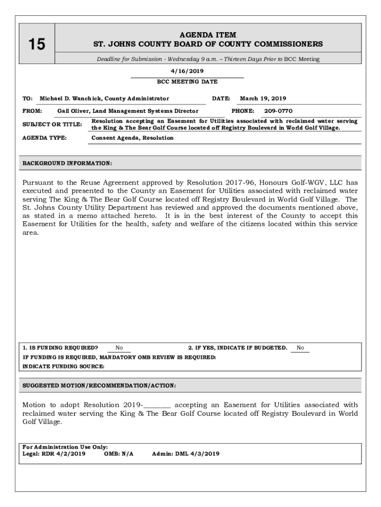 AGENDA ITEM ST. JOHNS COUNTY BOARD OF COUNTY COMMISSIONERS15Deadline for Submission Wednesday 9 a.m. Thirteen Days Prior to BCC Meeting 4/16/2019 BCC MEETING DATE TO:Michael D. Wan chick, County AdministratorFROM:DATE:Gail
