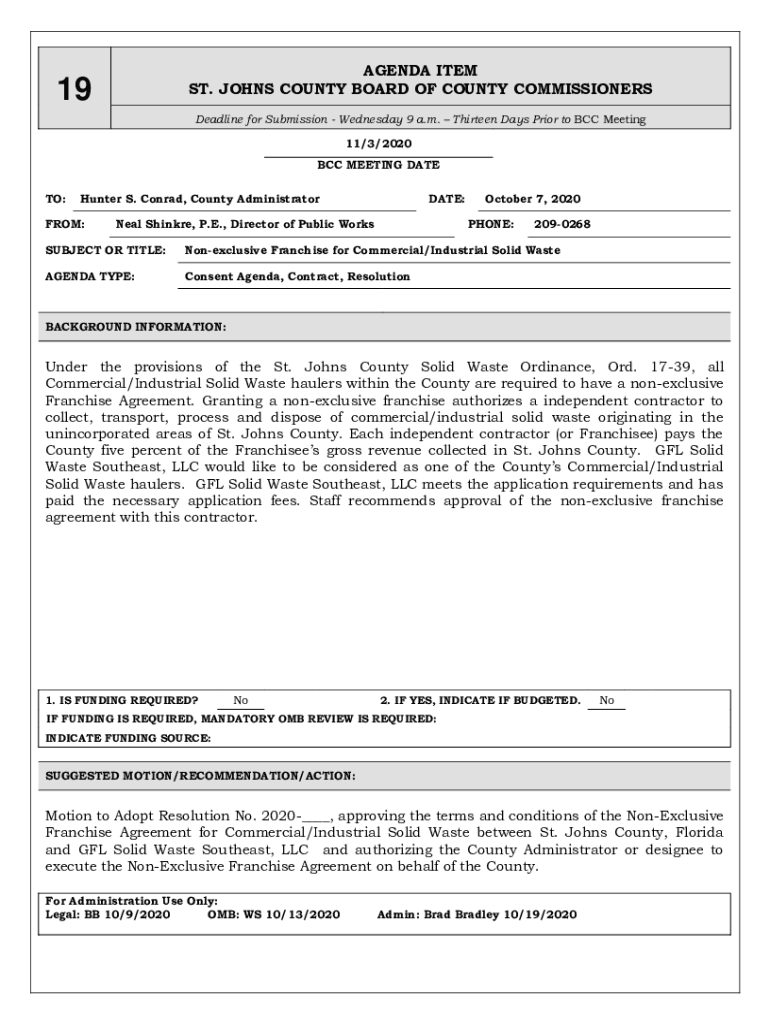 ST. JOHNS COUNTY BOARD OF COUNTY COMMISSIONERS19Deadline for Submission Wednesday 9 a.m. Thirteen Days Prior to BCC Meeting