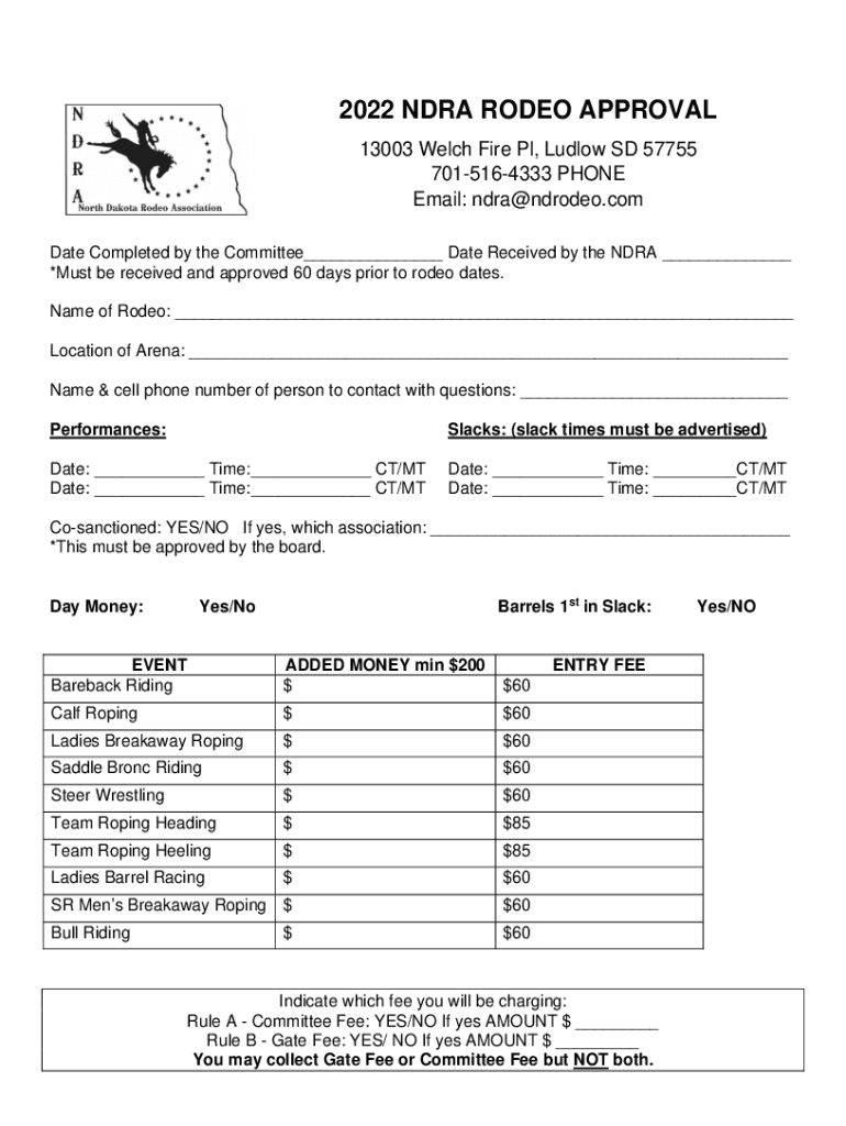 2022 INDRA RODEO APPROVAL 13003 Welch Fire Pl, Ludo SD 57755 7015164333 PHONE Email: ndra@ndrodeo.com Date Completed by the Committee___ Date Received by the INDRA ___ *Must be received and approved