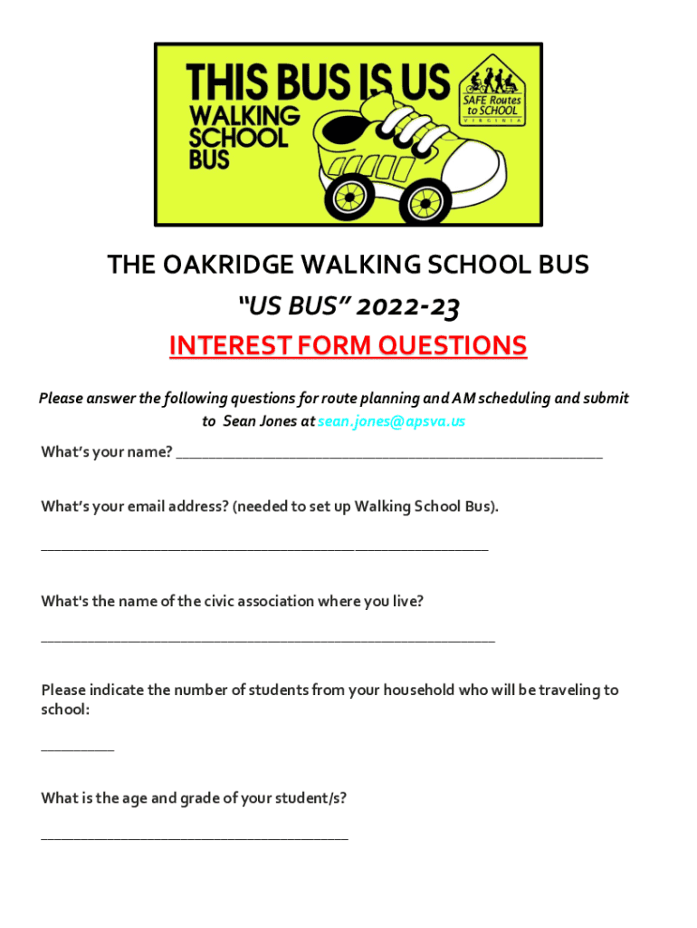 To ABRIDGE WALKING SCHOOL BUS US BUS 202223 INTEREST FORM QUESTIONS Please answer the following questions for route planning and Am I scheduling and submit to Sean Jones at sean.jones@apsva.us What's
