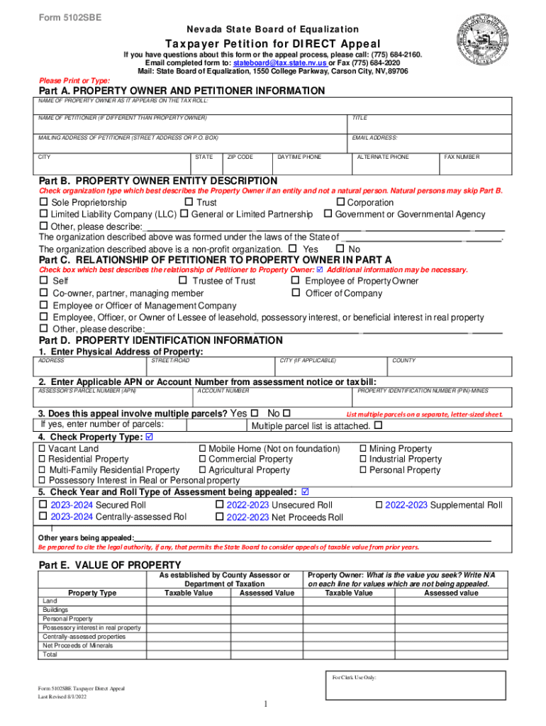 Form 5102SBENevada State Board of EqualizationTaxpayer Petition for DIRECT Appeal If you have questions about this form or the appeal process, please call: (775) 6842160. Email completed form to: