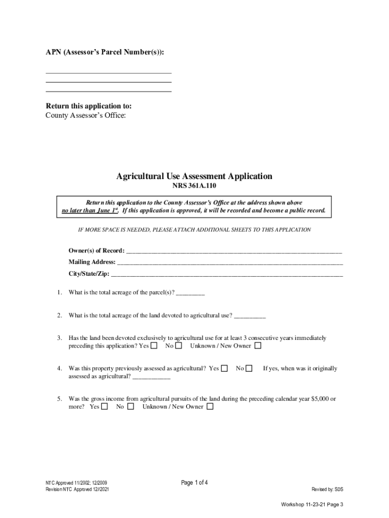 APN (Assessors Parcel Number(s)): ___ ___ ___ Return this application to: County Assessors Office:Agricultural Use Assessment Application NRS 361A.110 Return this application to the County Assessors