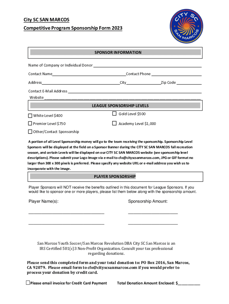 City SC SAN MARCOS Competitive Program Sponsorship Form 2023SPONSOR INFORMATION Name of Company or Individual Donor Contact Recontact PhoneAddressCityZip Recontact Email Address Website ___LEAGUE