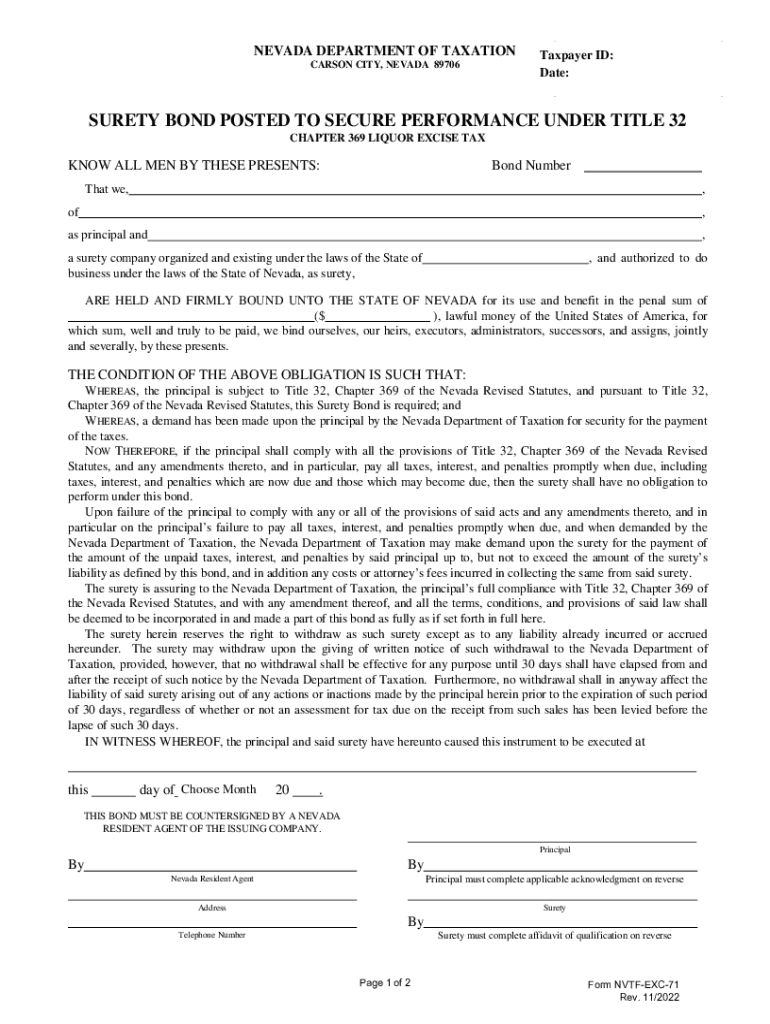 NEVADA DEPARTMENT OF TAXATION CARSON CITY, NEVADA 89706Taxpayer ID: Date:SURETY BOND POSTED TO SECURE PERFORMANCE UNDER TITLE 32 CHAPTER 369 LIQUOR EXCISE KNOW ALL MEN BY THESE PRESENTS:Bond NumberThat