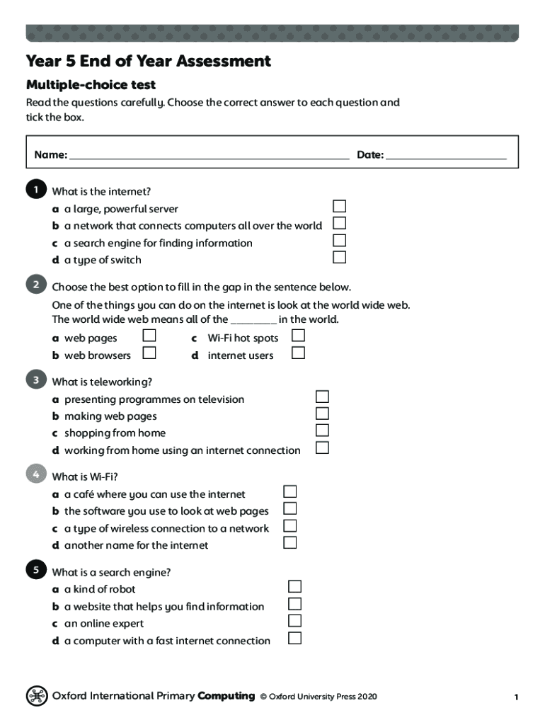 Year 5 End of Year Assessment Multiple choice test Read the questions carefully. Choose the correct answer to each question and tick the box. Name: ___ Date: ___ 1What is the internet? A large, powerful