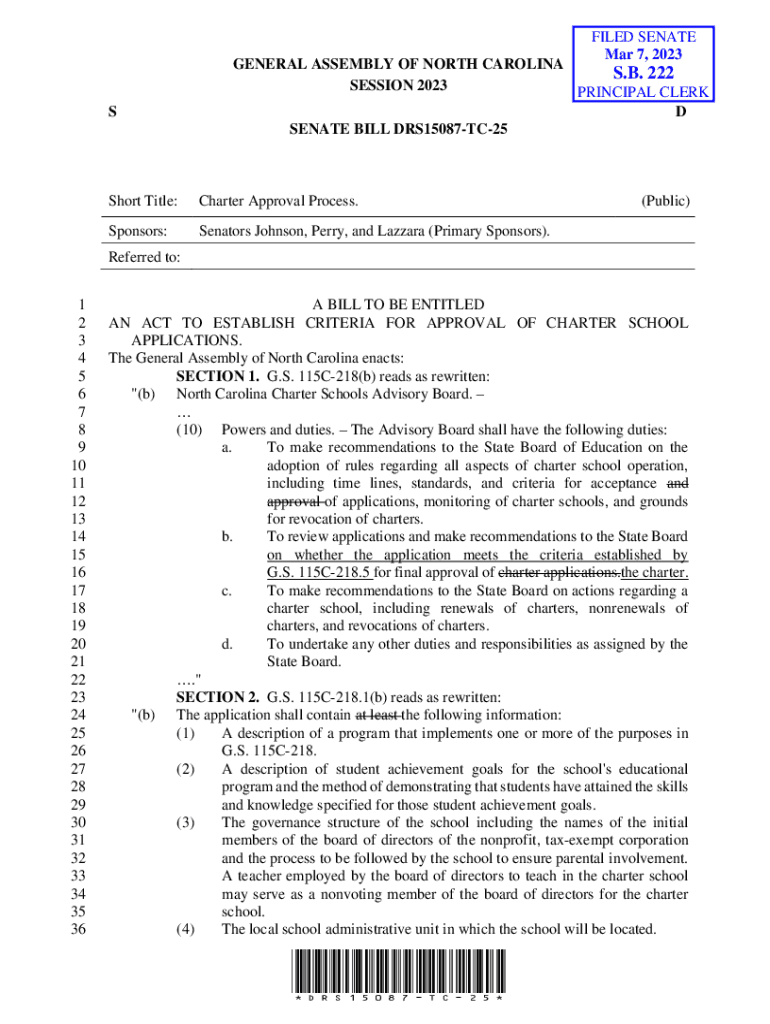 FILED SENATE Mar 7, 2023SGENERAL ASSEMBLY OF NORTH CAROLINA S.B. 222 SESSION 2023 PRINCIPAL CLERK D SENATE BILL DRS15087TC25Short Title:Charter Approval Process. Sponsors:Senators Johnson, Perry,