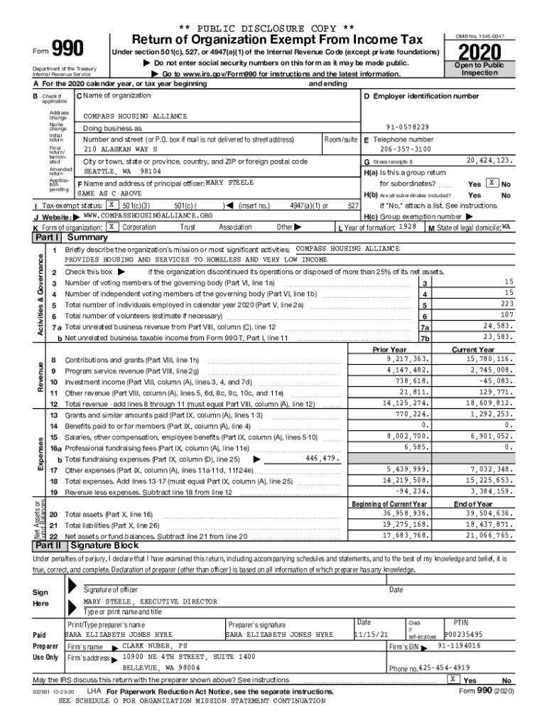 ** PUBLIC DISCLOSURE COPY ** Form990Return of Organization Exempt From Income Tax OMB No. 15450047| Do not enter social security numbers on this form as it may be made public. Open to Public Inspection2020Under
