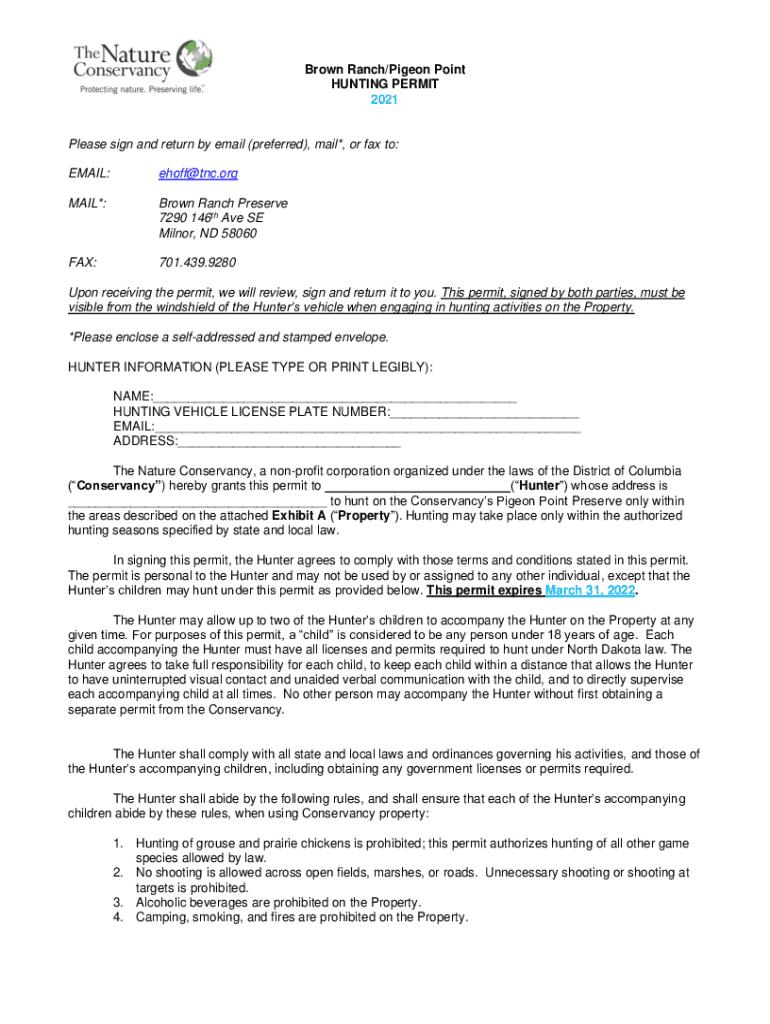 Brown Ranch/Pigeon Point HUNTING PERMIT 2021Please sign and return by email (preferred), mail×, or fax to: EMAIL:ehoff@tnc. Gmail*:Brown Ranch Preserve 7290 146th Ave SE Minor, ND 58060FAX:701.439.9280Upon
