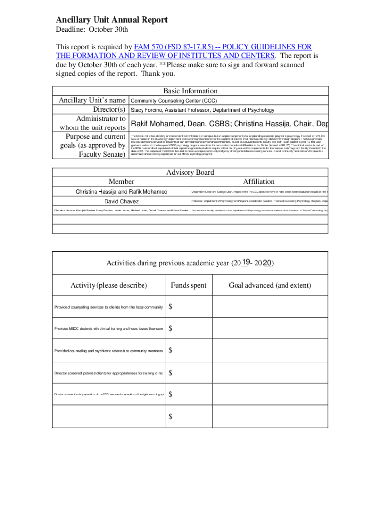 Ancillary Unit Annual Report Deadline: October 30th This report is required by FAM 570 (FSD 8717. R5) POLICY GUIDELINES FOR THE FORMATION AND REVIEW OF INSTITUTES AND CENTERS. The report is due by