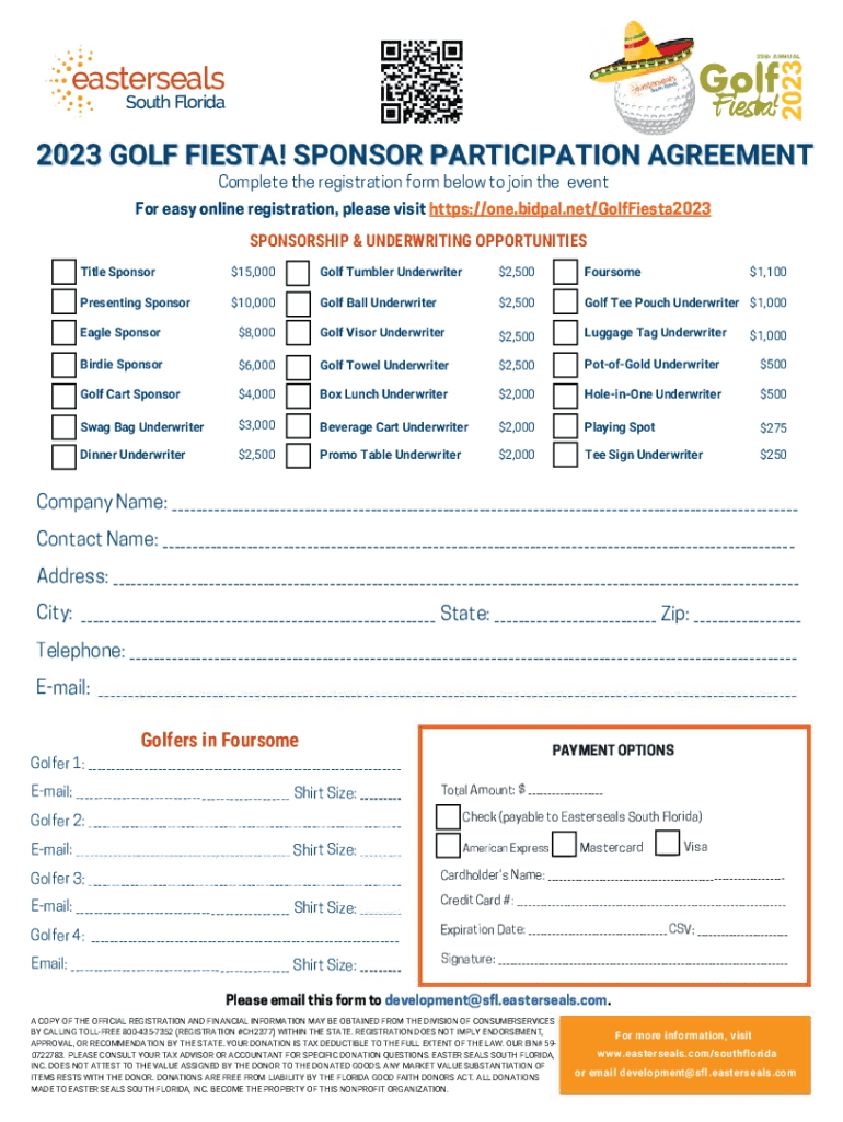 . . . . .:.::._. Easterseals :. South Florida 29th ANNUALp2023 GOLF FIESTA! SPONSOR PARTICIPATION AGREEMENT Complete the registration form below to join the event For easy online registration, please