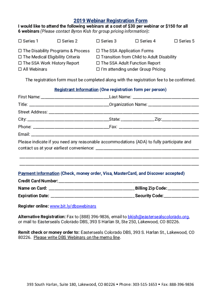 2019 Webinar Registration Form would like to attend the following webinars at a cost of $30 per webinar or $150 for all 6 webinars (Please contact Byron Fish for group pricing information): Series