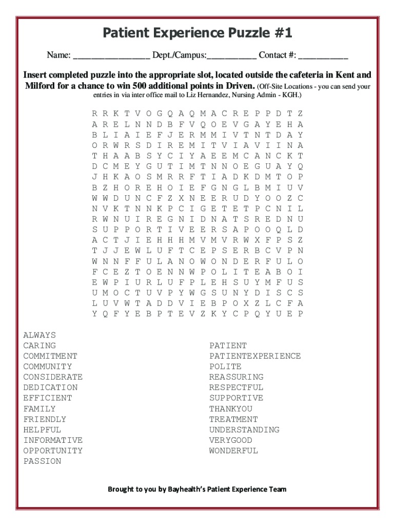 Patient Experience Puzzle #1 Name: ___ Dept./Campus:___ Contact #: ___ Insert completed puzzle into the appropriate slot, located outside the cafeteria in Kent and Milford for a chance to win 500