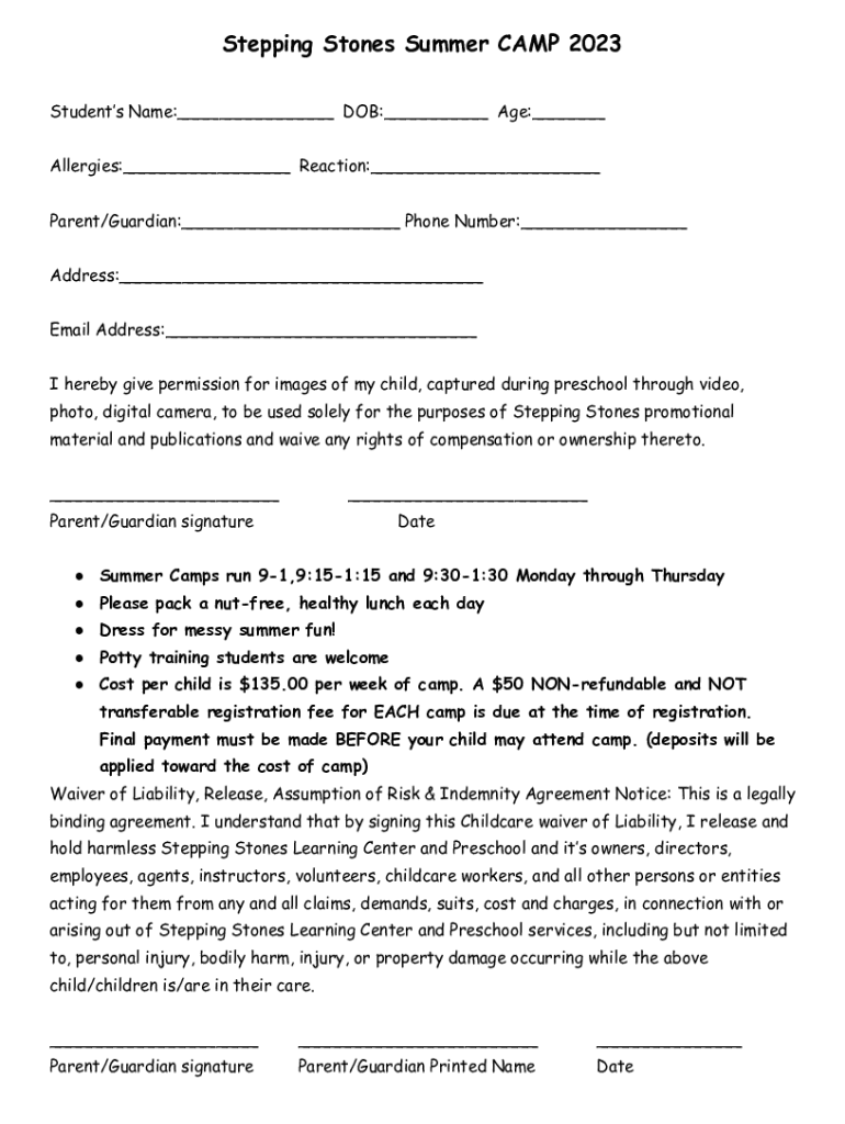 Stepping Stones Summer CAMP 2023 Students Name:___ DOB:___ Age:___ Allergies:___ Reaction:___ Parent/Guardian:___ Phone Number:___ Address:___ Email Address:___ I hereby give permission for images