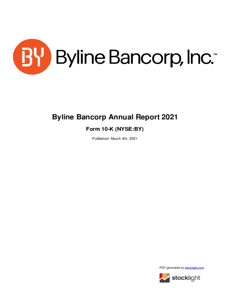 Byline Ban corp Annual Report 2021 Form 10K (NYSE:BY) Published: March 4th, 2021PDF generated by stock light. Counted STATES SECURITIES AND EXCHANGE COMMISSION Washington, D.C. 20549FORM 10K (Mark