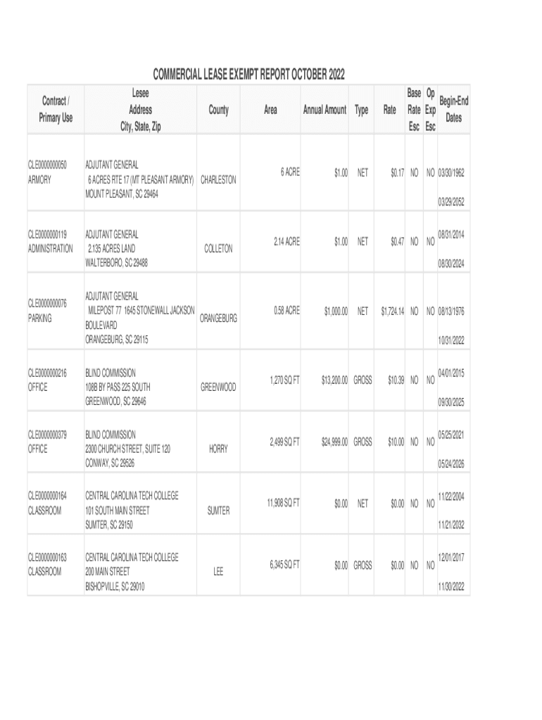 COMMERCIAL LEASE EXEMPT REPORT OCTOBER 2022 Contract / Primary UseCLE0000000050 ARMORYCLE0000000119 ADMINISTRATIONCLE0000000076 PARKINGCLE0000000216 OFFICECLE0000000379 OFFICECLE0000000164 CLASSROOMCLE0000000163