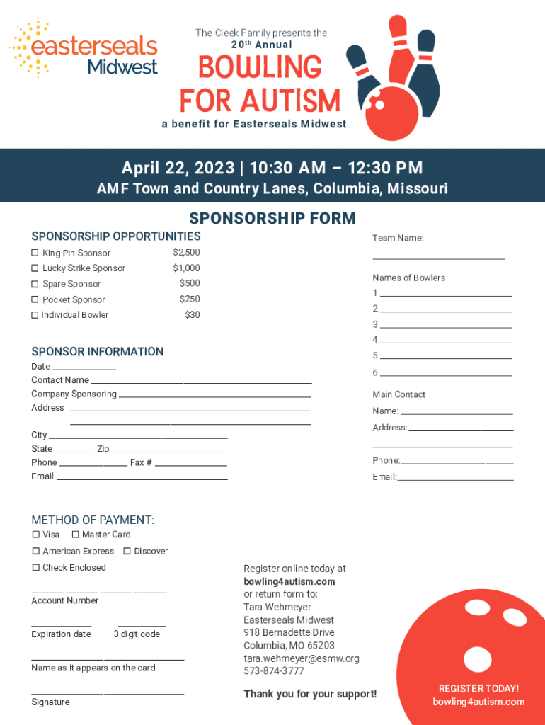 The Creek Family presents the 2 0 t h An n u a bowling FOR Autism benefit for Easterseals Midwest April 22, 2023 | 10:30 AM 12:30 PM AMF Town and Country Lanes, Columbia, MO 2023 BOWLING FOR AUTISM