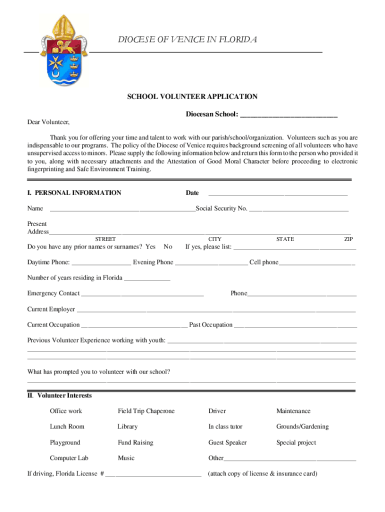 DIOCESE OF VENICE IN FLORIDASCHOOL VOLUNTEER APPLICATION