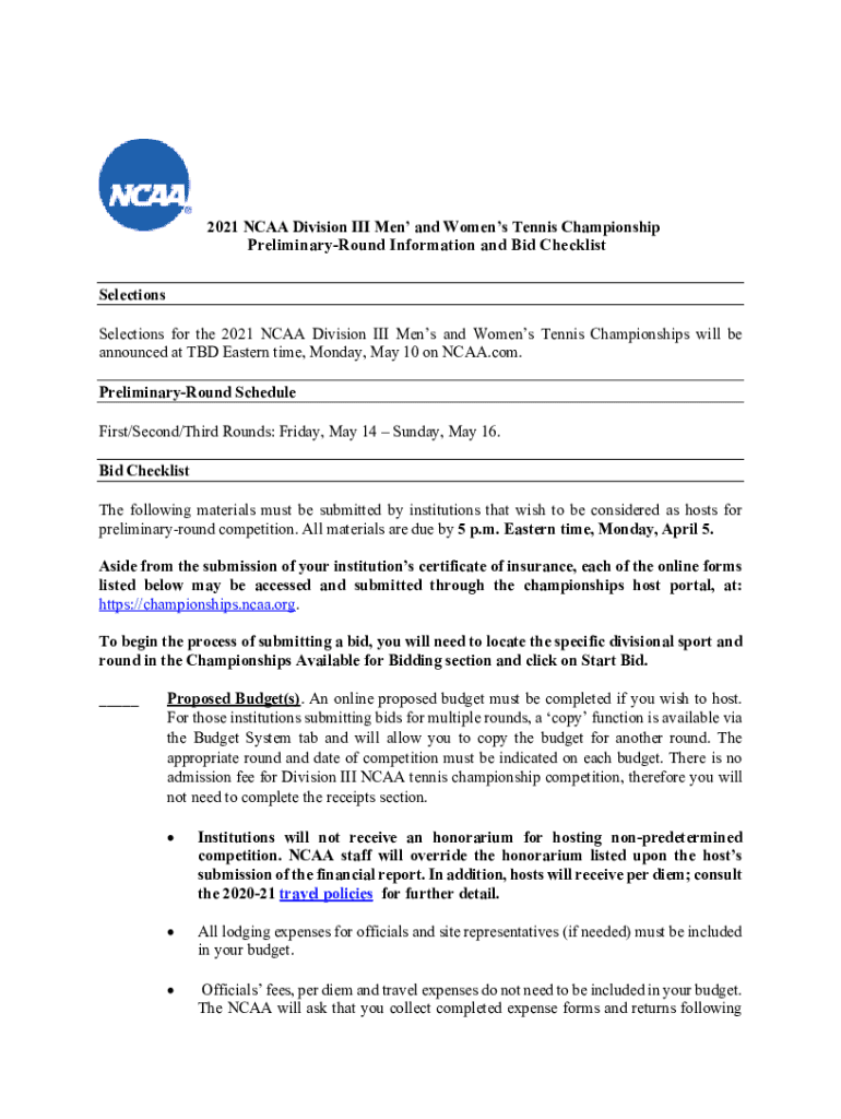 Selections for the 2021 NCAA Division III Men and Women's Tennis Championships will be