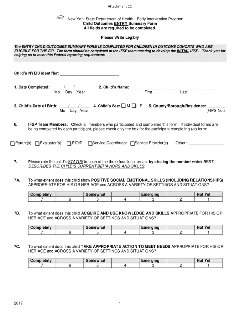Attachment CC New York State Department of Health Early Intervention Program Child Outcomes ENTRY Summary Form All fields are required to be completed. Please Write Legibly The ENTRY CHILD OUTCOMES