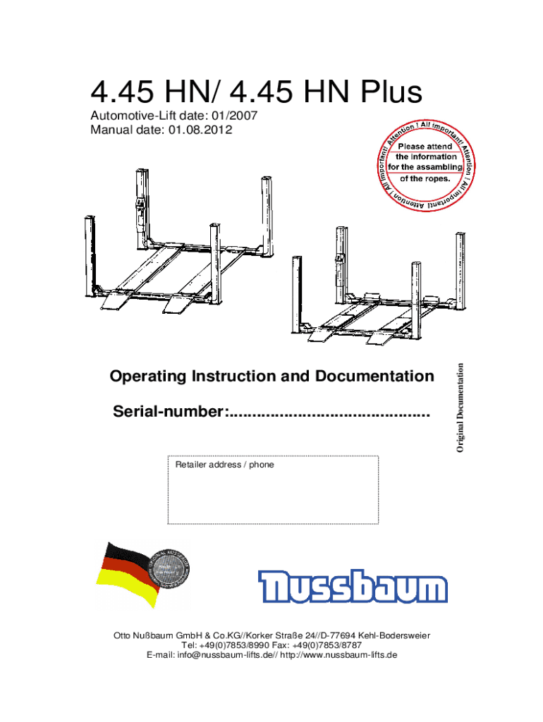 Serial number:............................................ Retailer address / phone Otto Baum GmbH & Co.KG//Korker Straw 24//D77694 KehlBodersweier